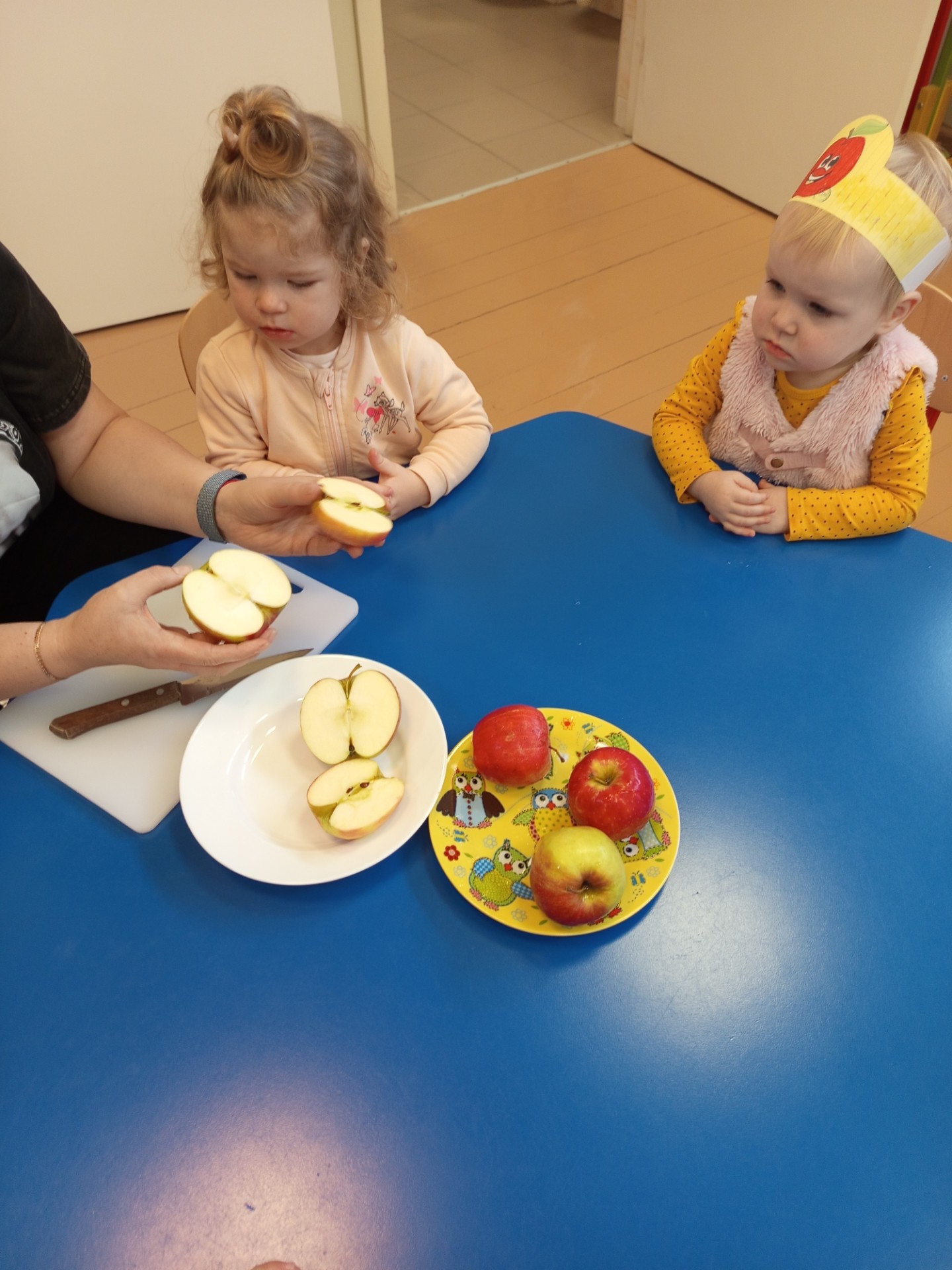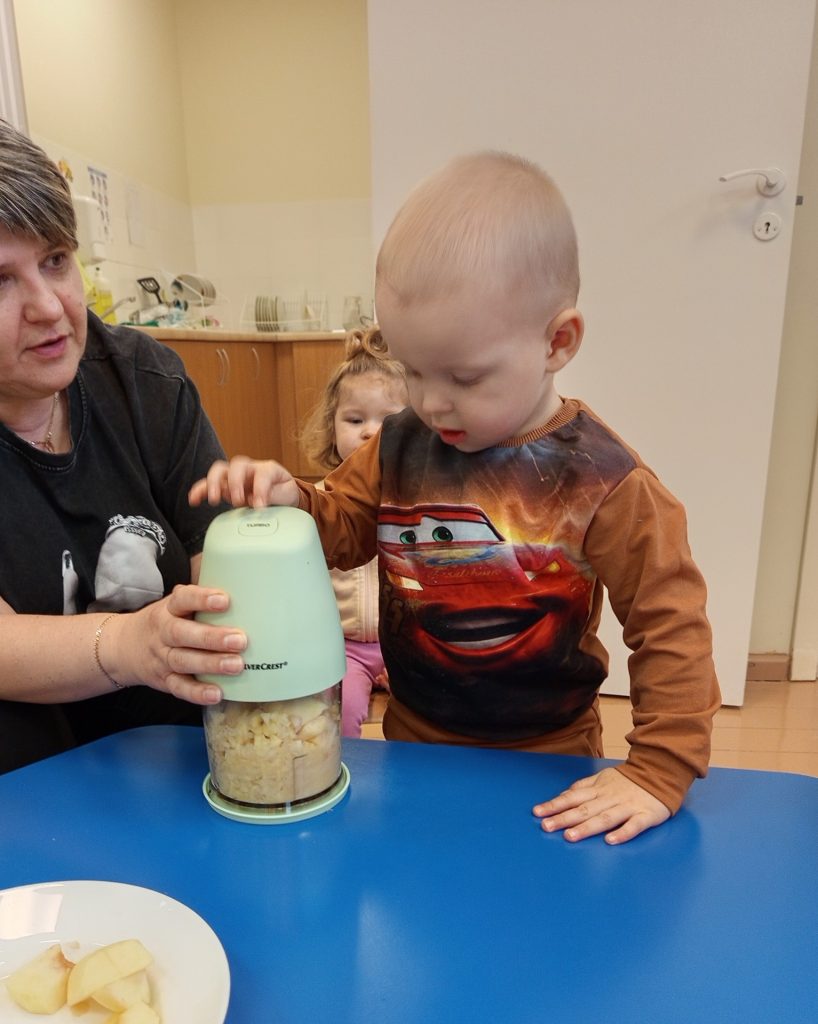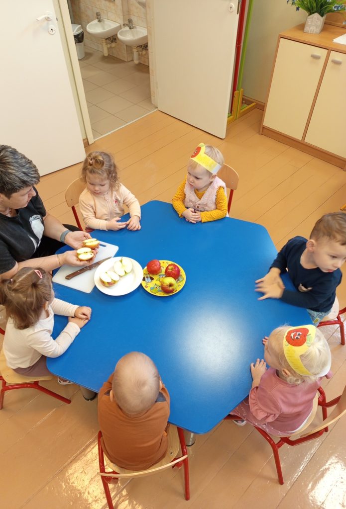Dziś w naszej grupie obchodziliśmy Dzień Jabłka. Dzieci oglądały jabłka – czerwone, małe, duże. Wąchały je i dotykały, sprawdzając, jakie są gładkie i pachnące. Potem wspólnie zaglądaliśmy do środka jabłka – zobaczyliśmy pestki i miąższ. Dzieci próbowały kawałków jabłka, poznając, że jedno jest słodsze, a inne bardziej kwaśne. Na koniec razem z paniami przygotowaliśmy mały jabłkowy deser – miękki mus z jabłek. Wszystkim bardzo smakował!