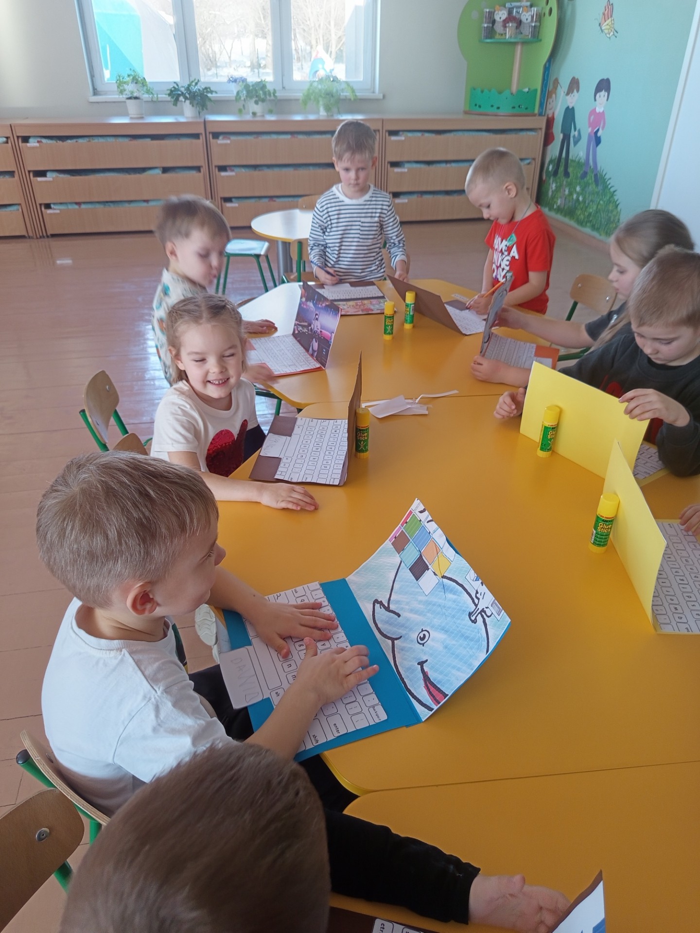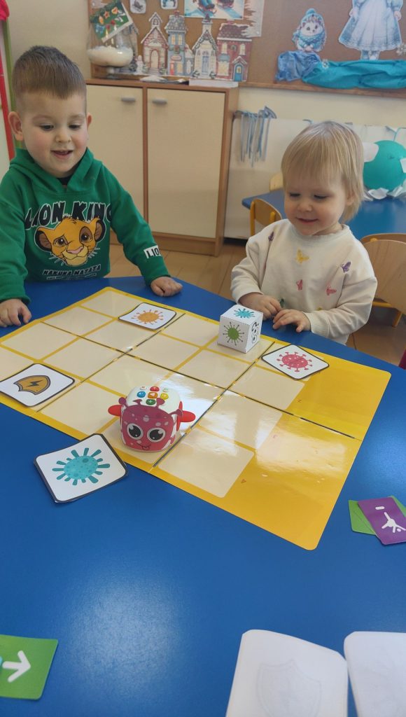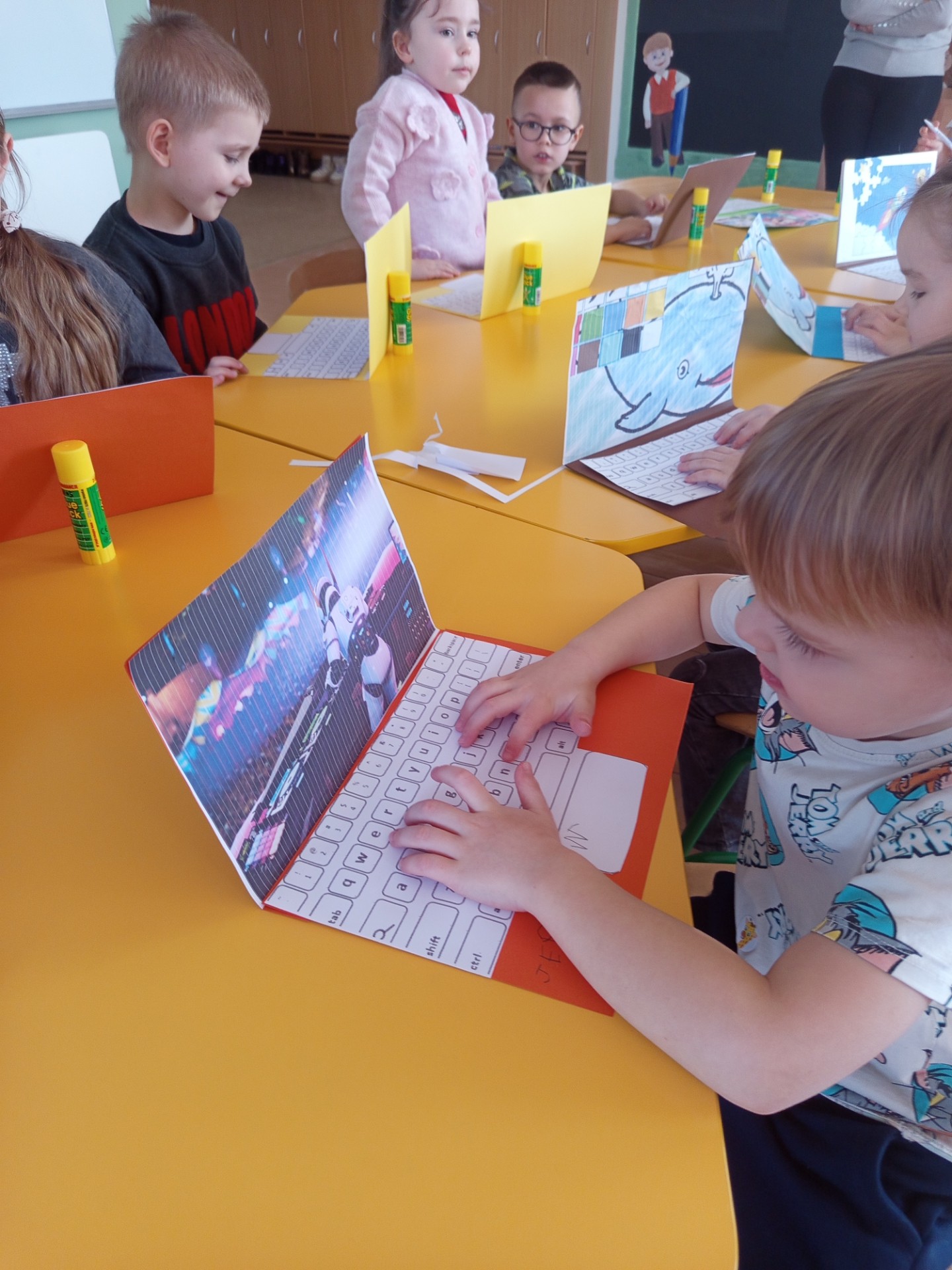 Przy stolikach dzieci kolorowały papierowe komputery, a następnie wybierały naklejki i ozdabiały swoje prace naklejkami;