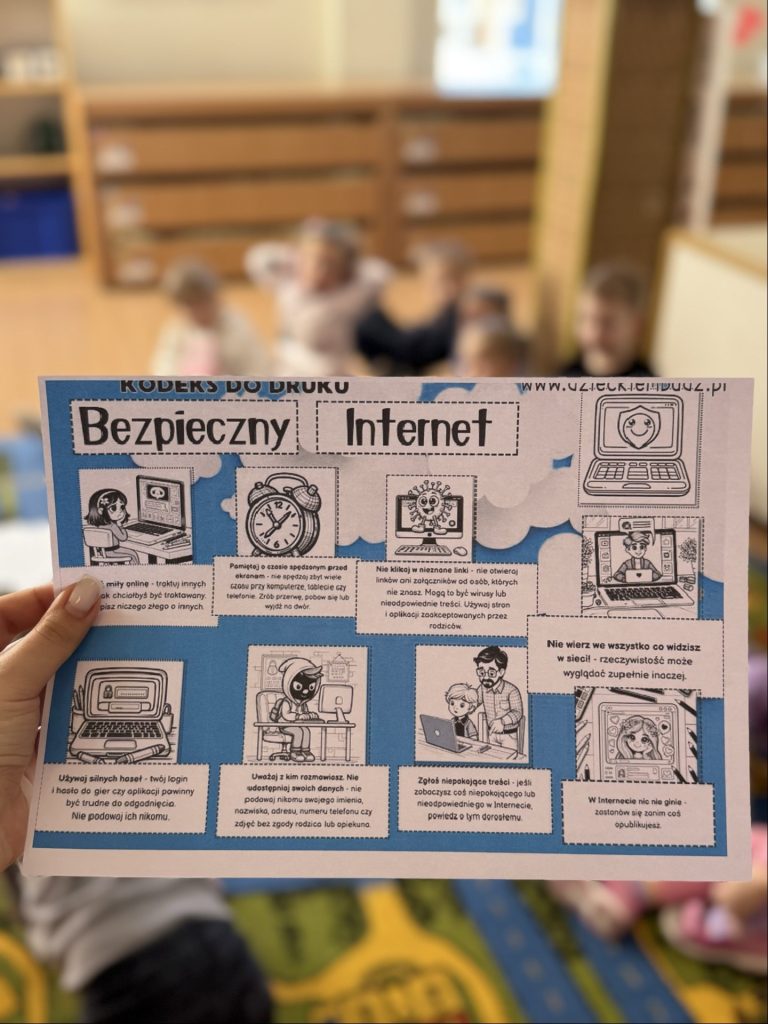 Poznaliśmy również sześć głównych zasad bezpiecznego zachowania się w Internecie. Następnie wysłuchaliśmy bajki pt. „Zosia i tajemnice bezpiecznego Internetu”, która pomogła dzieciom lepiej zrozumieć zagrożenia i właściwe zachowania na przykładach z życia codziennego.