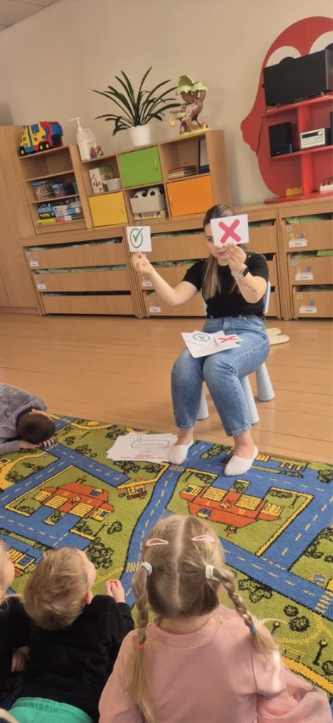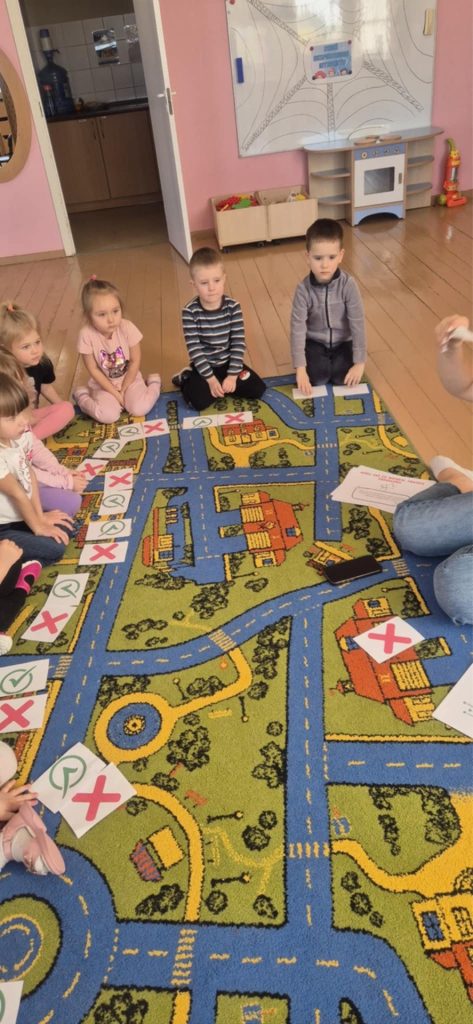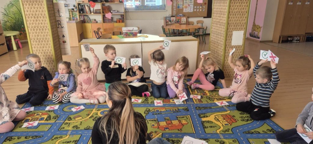 Aby utrwalić zdobytą wiedzę, zagraliśmy w grę „Dobrze czy źle?”. Dzieci z dużym zaangażowaniem oceniały różne sytuacje, pokazując kartki z odpowiedziami.
