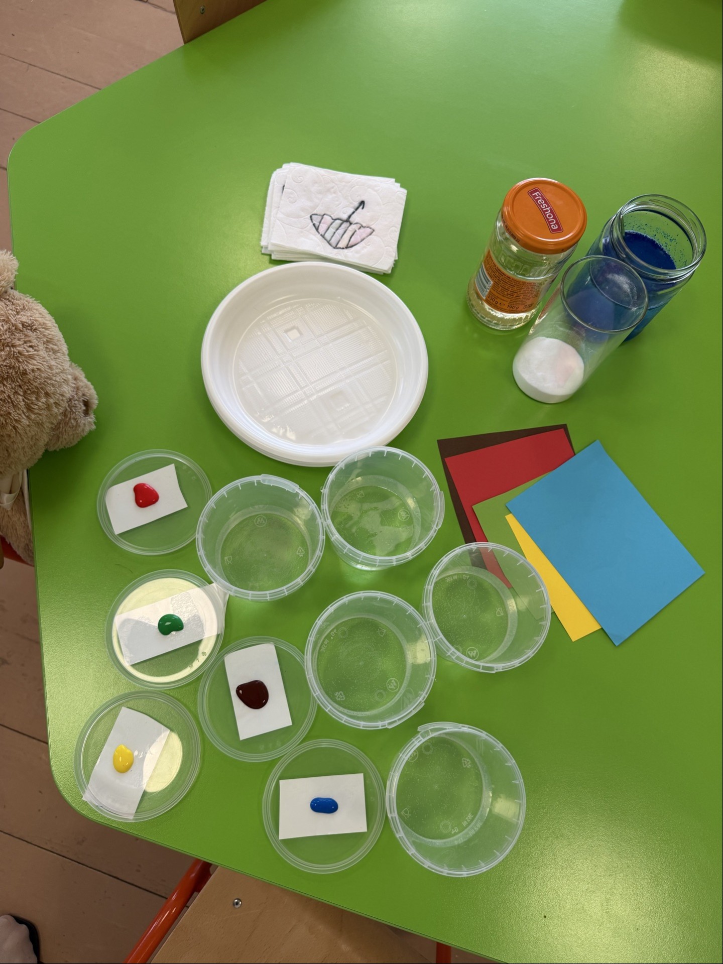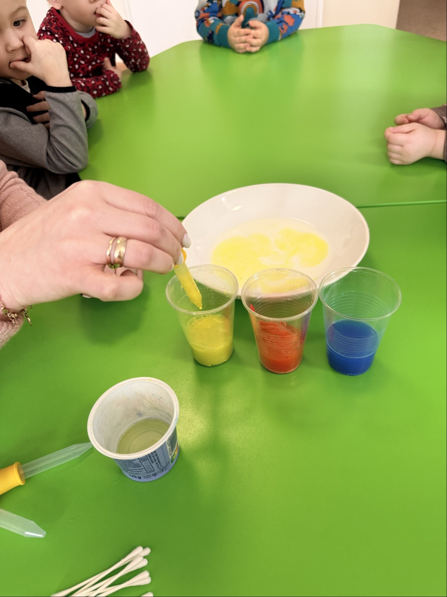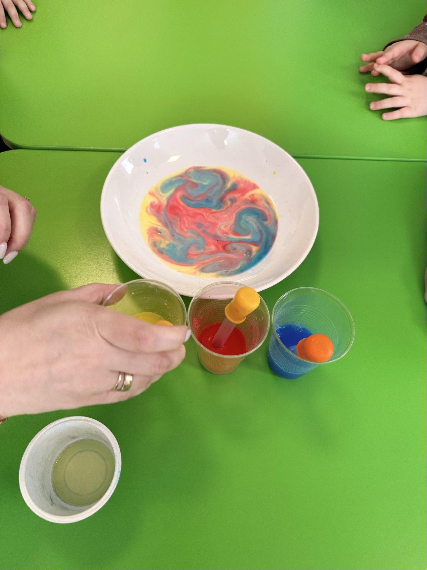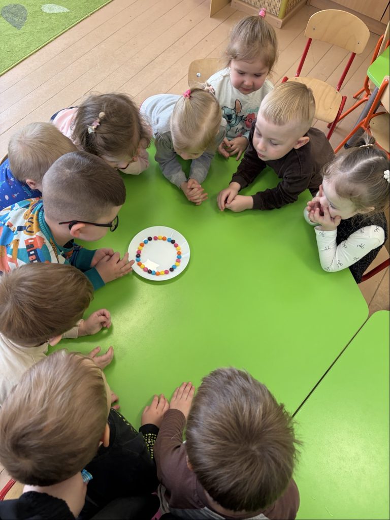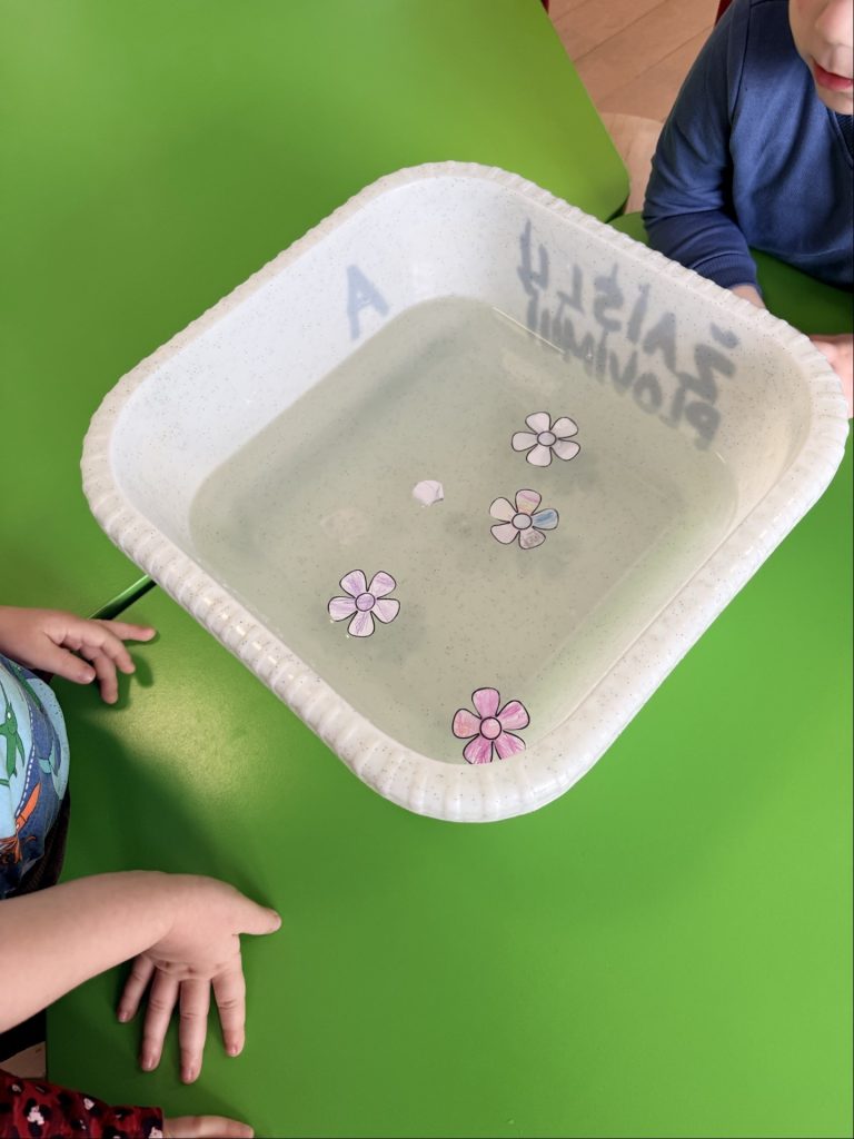 W ciągu tygodnia w grupach “Biedroneczki” i “Krasnoludki” realizowane były różnorodne aktywności badawcze, dopasowane do wieku i możliwości dzieci. Świetnie sprawdzały się eksperymenty z wodą, powietrzem, kolorami i światłem: mieszanie barw, „deszcz w słoiku”, pływanie i tonięcie różnych przedmiotów, tworzenie baniek mydlanych.