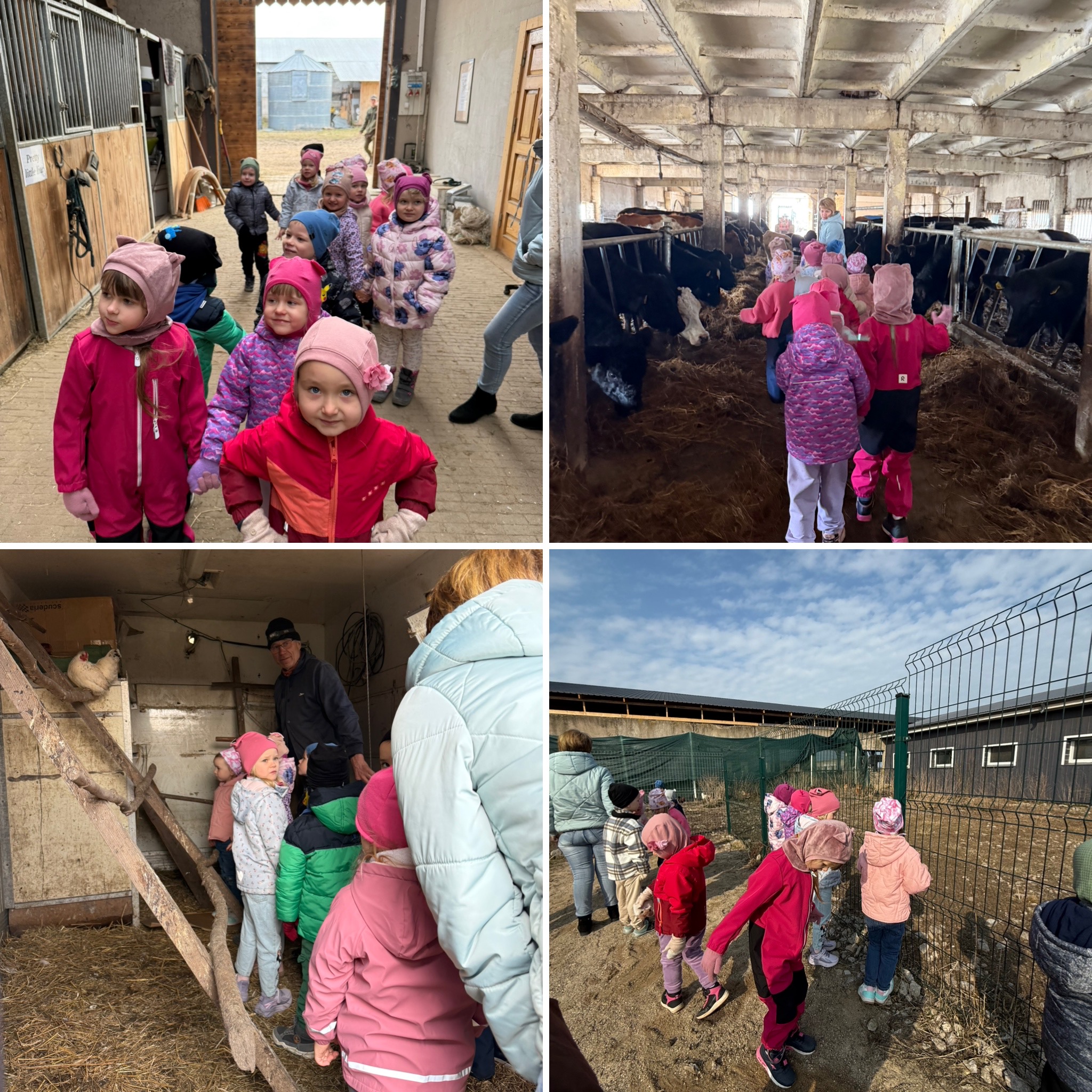 Podczas wizyty dzieci miały okazję zobaczyć z bliska różne zwierzęta gospodarskie – króliki, krowy, owce oraz kury. Zwiedziły stajnię i inne miejsca na terenie farmy, poznając codzienne życie oraz pracę związaną z opieką nad zwierzętami. Dzieci z dużym zainteresowaniem obserwowały zwierzęta i chętnie słuchały ciekawostek na ich temat.